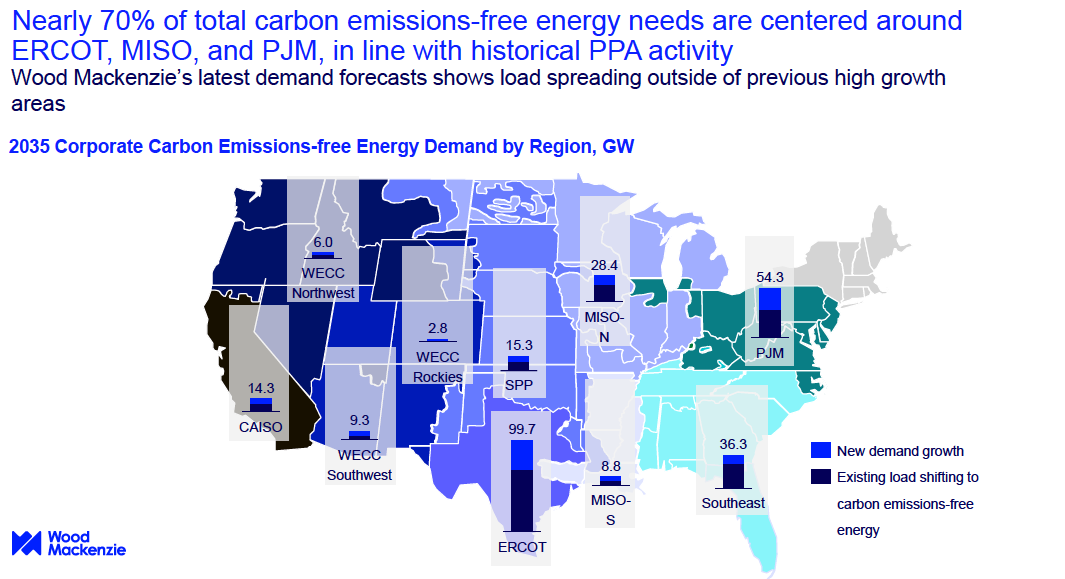 The report, “U.S. Corporate Carbon Emissions-Free Energy Demand Outlook” provides a forecast of corporate emissions-free energy demand trends across the United States. The analysis assumes fairly conservative demand growth compared to other recent forecasts, such as that of Grid Strategies, because Wood Mackenzie assumes supply-side constraints driven by transmission bottlenecks and interconnection queue backlogs will rein in how fast the nation can meet requests for more electricity.